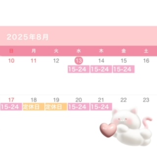 ♡ お盆のしふと ♡ 日記 X Facebook はてブ LINE コピー 2025.08.13 こんにちは、みぃなです^ ܸ. ̫ .ܸ ^♡ 金曜日はご指名、ご来店 ありがとうございました! 21日までのスケジュールです♡ 変更等の可能性もあるので 当日HPかお電話で出勤確認 お願いします!(ᐡᴗ ̫ ᴗᐡ)♡ 今日は、15時~0時までいてます! 予定なくてひまな予定なので、 あいにきてくださいね! ♡ みぃな ♡