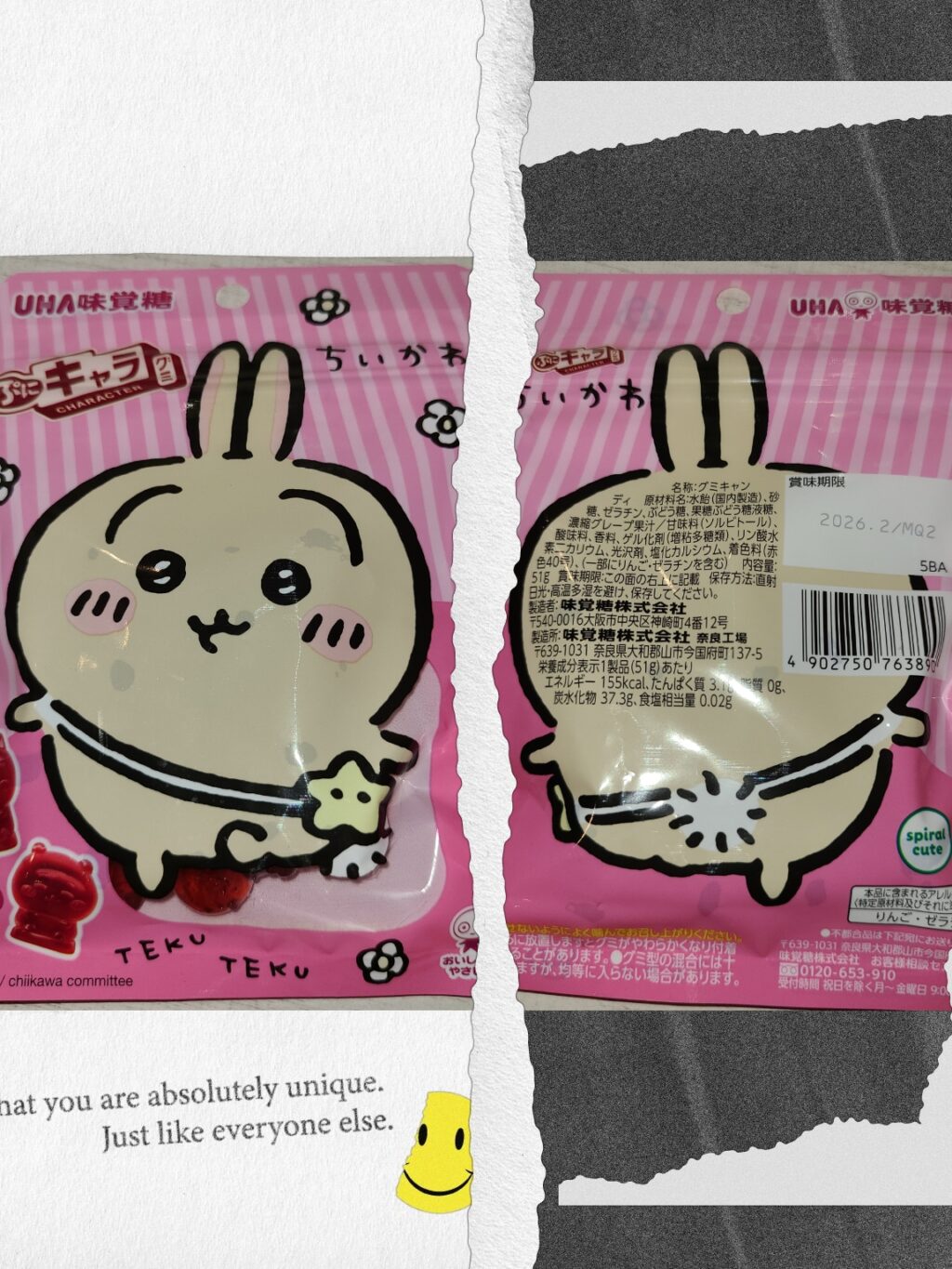ちいかわ 日記 X Facebook はてブ LINE コピー 2025.07.09 お店に出勤する時は 毎回、コンビニに寄って お買い物をしてから お店に向かっています? 何時も通りに 大好きなグミコーナーを 見ていたら ちいかわのグミを発見? しかも、パッケージが 推しのうさぎだったので 即買いしちゃいました? うさぎパッケージ めちゃくちゃ可愛いよ? しかも、裏パッケージも うさぎの後ろ姿で めちゃくちゃ可愛いよ❣️ 本日は15時〜21時迄です?
