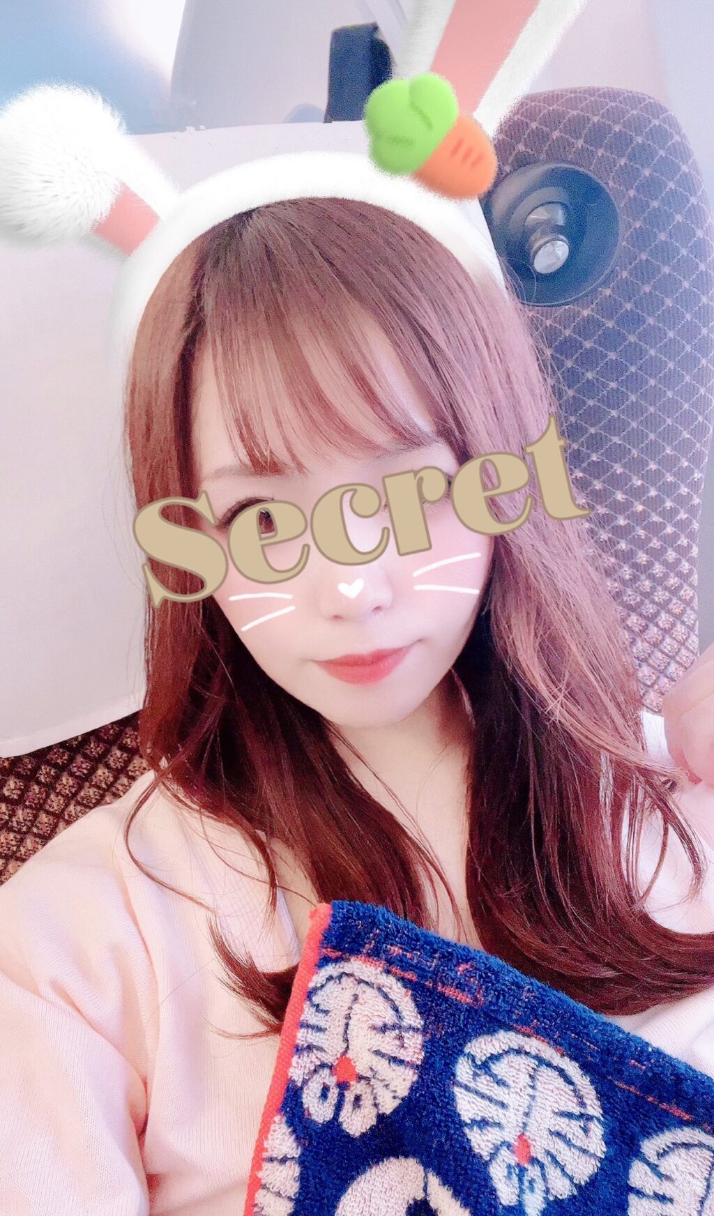 今朝新幹線でなんかよくわからないウサギのフィルターで撮った写真🐰お気に入りのドラちゃんのハンカチと♡